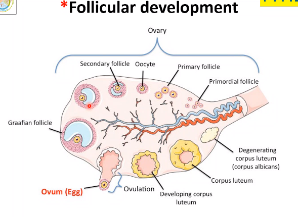- Graafian follicle erupts (causes a fall in oestrogen level) to release and becomes the corpus luteum which secretes both progesterone and oestrogen